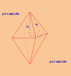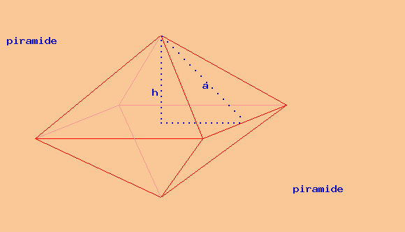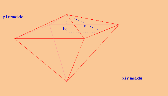 Un solido è formato da due piramidi rette a base quadrata congruenti e con le basi coincidenti. Lo spigolo di base è di 20 cm; il volume del solido è di 6400 cm³. Calcola l'area totale del solido.