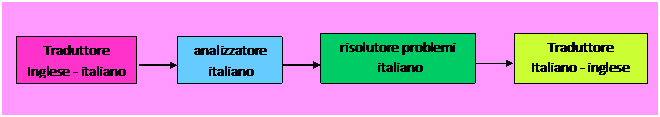Come si vede dallo schema la versione inglese del risolutore di problemi si avvale del risolutore dei problemi in italiano. Giusto per smentire quanti, per interessi personali, hanno diffuso voci che la lingua inglese sia necessaria per l'uso del computer. La intelligenza artificiale, basata sul linguaggio umano, si sviluppa meglio con le lingue neolatine, quali italiano, spagnolo e francese; questo è dovuto al fatto che la grammatica latina, e quindi anche quella italiana, che ne rappresenta la naturale evoluzione, si avvale di articoli, forme verbali, pronomi, sostantivi e aggettivi che descrivono con precisione una idea espressa in forma scritta; cosa, questa, che la rozza lingua inglese non permette.