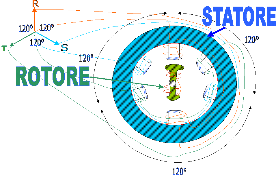 Tali bobine vengono alimentate dal sistema trifase di tensioni; vengono, quindi, percorse da una certa corrente, e si ha luogo ad un campo magnetico variabile, generato ciascuno dalle tre bobine. Nella zona compresa tra le tre bobine il campo magnetico sarà la somma dei tre campi magnetici delle tre bobine. Ma poiché le bobine sono collegate sullo statore con un angolo meccanico pari a 120° ed inoltre il sistema trifase di tensioni è anche esso sfasato dal punto di vista elettrico di un angolo pari a 120° elettrici, il campo magnetico risultante non sarà fisso ma sarà variabile; questo campo magnetico ruota attorno all’asse del motore con una frequenza fissa: