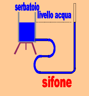 Il sifone è un piccolo circuito idraulico che non ha una pompa ma sfrutta l'effetto dell'acqua che si trova ad una certa altezza. Se noi, infatti, riempiamo dei tubi di acqua essi hanno tutti lo stesso livello dell'acqua, se li lasciamo scoperti in qualche punto, cioè senza chiudere i tubi. Nella figura vediamo che da sola l'acqua è scesa sotto lo sgabello su cui è posto il serbatoio di acqua ed è risalita sopra, fino a raggiungere il livello superiore dell'acqua del serbatoio. E' questo che si chiama effetto sifone, cioè il fatto che da sola l'acqua prima scende e poi risale.