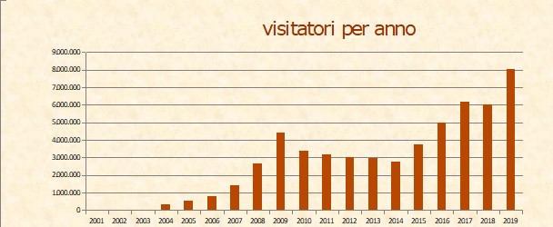 | visitatori | 276.898 | 500.086 | 776.818 | 1.368.042 | 2.655.840 | 4.398.998 | 3.353.302 | 3.163.669 | 3.013.492 | 2.956.687 | 2.758.988 | 3.757.212 | 4.979.503 | |||