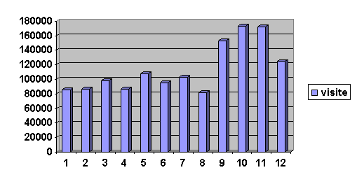 | visite | 85.784 | 86.641 | 98.317 | 86.307 | 107.494 | 95.198 | 103.195 | 81.779 | 153.276 | 173.388 | 172.079 | 124.584 | 1.368.042 |