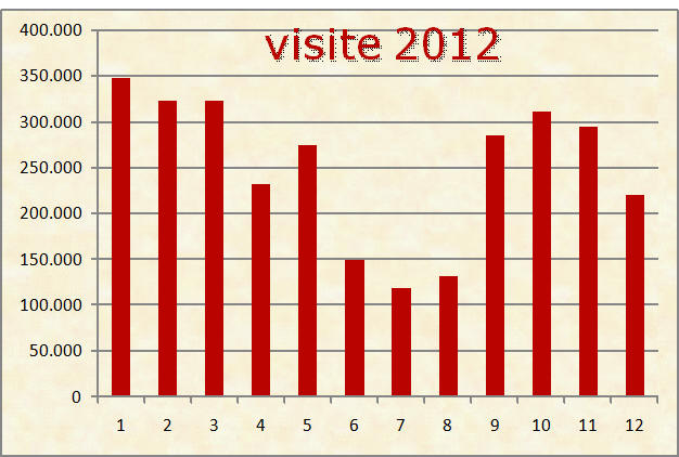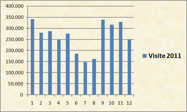 | visite | 327.213 | 281.531 | 291.180 | 294.143 | 264.280 | 152.347 | 117.695 | 112.095 | 262.629 | 304.929 | 315.952 | 232.693 | 2.956.687 |