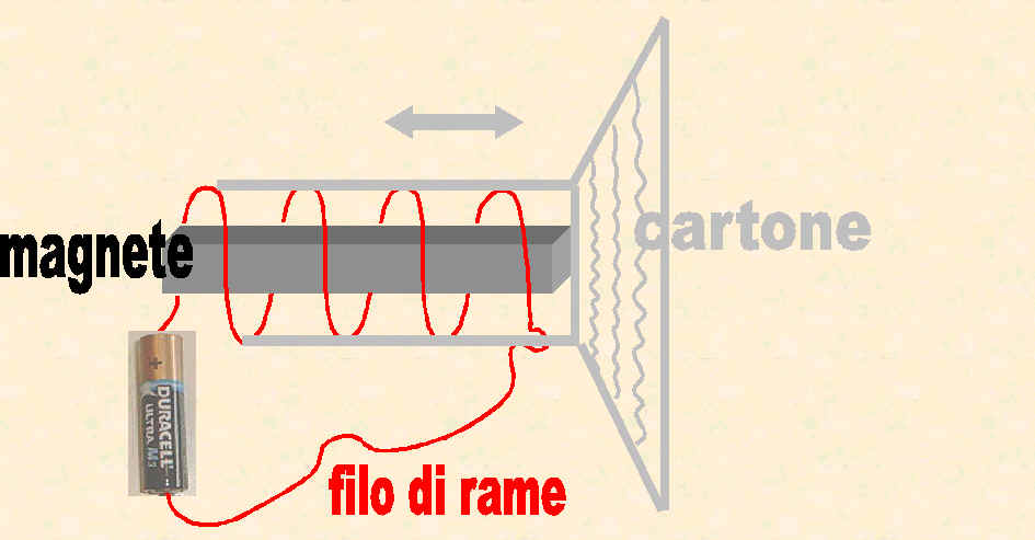 Se colleghiamo il filo ad una pila notiamo che il cono di cartone sbalza subito in avanti e poi ritorna indietro. Contemporaneamente sentiamo un forte rumore; questo vuol dire che l'altoparlante funziona; cioè riesce a trasformare la corrente elettrica in un suono o rumore.